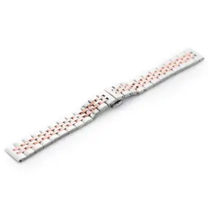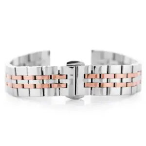 Elegáns, ezüst és rózsaarany színű acél óraszíj, amely kiváló minőségű karórákhoz készült. A pillangócsat kényelmes, biztonságos záródást és letisztult megjelenést biztosít.
