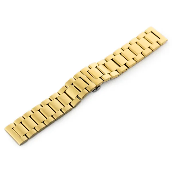 Arany színű, acél óraszíj pillangócsattal, igényes kivitelű karórákhoz. Elegáns megjelenést biztosít, miközben stabil és kényelmes viseletet nyújt a mindennapokban.