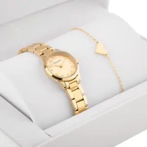 Elegáns ajándékszett arany színű női órával, szívecskés karkötővel és díszdobozzal, így az ajándékozás egyszerű és igazán különleges. A japán Miyota szerkezet, az állítható zár és az antiallergén bevonat kényelmes, megbízható mindennapi viseletet biztosít.