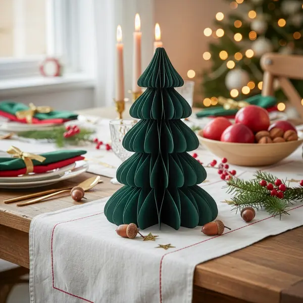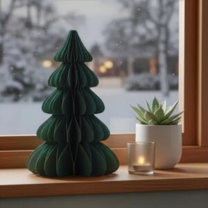 Mutatós, sötétzöld papír fenyődekoráció, amely pillanatok alatt ünnepi hangulatot teremt az asztalon vagy a polcon. A mágneses záródásnak köszönhetően könnyen összeállítható, stabilan tartja a formáját, és helytakarékosan tárolható a szezon végén.