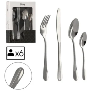 A Paris 24 részes evőeszközkészlet elegáns, mégis időtálló választás mindennapos és ünnepi terítékhez egyaránt. A fényes, rozsdamentes acél felület egyszerre biztosít tartósságot és stílusos megjelenést, miközben ergonomikus kialakítása kényelmes fogást nyújt.