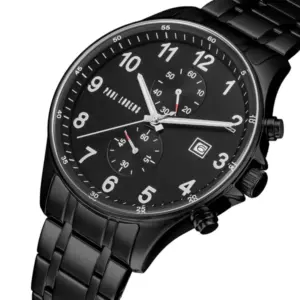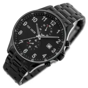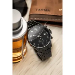 Elegáns, fekete megjelenésével és kronográf funkciójával praktikus és stílusos választás a mindennapokra. Rozsdamentes acél kivitele, ásványi üvege és dátumkijelzése tartós, kényelmes viseletet biztosít.