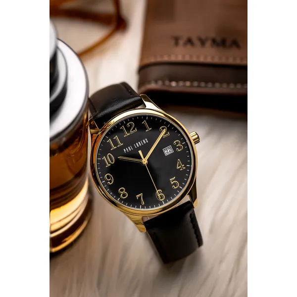 A Paul Lorens PL20016A-1A2 férfi karóra az elegáns megjelenést és a megbízható működést ötvözi. Az olaszos ihletésű formavilág, a gondosan kidolgozott részletek és a minőségi anyaghasználat révén stílusos választás mindennapi viselethez és alkalmi öltözékhez is. Klasszikus karakterét a fekete számlap, az aranyszínű tok és a fekete bőrszíj harmonikus kombinációja emeli ki.