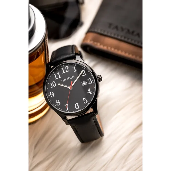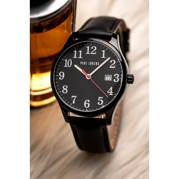 Paul Lorens férfi karóra fekete bőrszíjjal, dátummal, 41 mm
