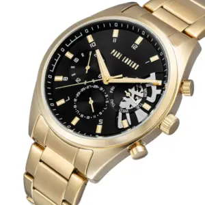 Elegáns, fekete-arany megjelenésű karóra, amely rozsdamentes acél kivitelével és japán Miyota szerkezetével stílusos és megbízható választás a mindennapokra. Az ajándék díszdoboz és táska még praktikusabbá teszi, ha meglepetésnek szánod.