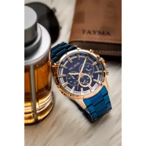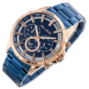 Elegáns, sötétkék és rozéarany színvilágú férfi karóra, amely stílusos megjelenést és praktikus funkciókat kínál a mindennapokra. A japán кварc szerkezet, a dátumkijelzés és a második időzóna megbízható, kényelmes használatot biztosít.