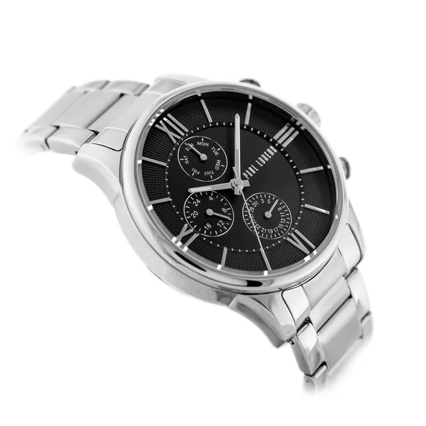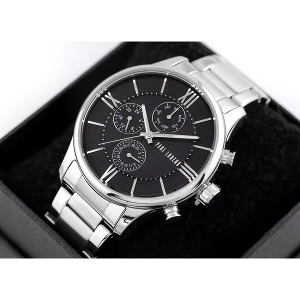 Elegáns, fekete számlapos férfi karóra ezüstszínű fém szíjjal, amely üzleti és hétköznapi öltözékhez is remekül illik. A pontos kvarc szerkezet, a praktikus dátumkijelzés és az ajándék díszdoboz kényelmes, stílusos választássá teszi.