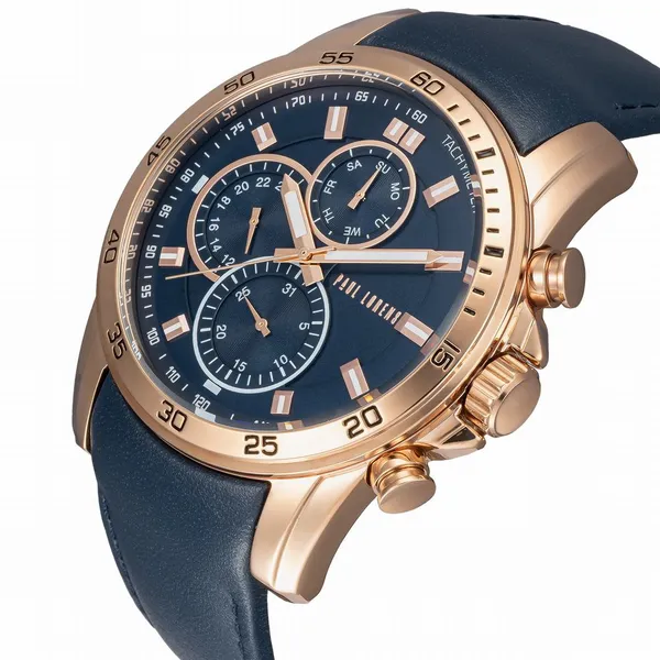 Precíz japán szerkezetű, rózsaarany tokos férfi karóra kék számlappal és bőr szíjjal, amely a WR30 cseppállóság és a dátumkijelzés kényelmét kínálja, elegáns díszdobozban érkezik – ajándéknak és mindennapi viselethez egyaránt tökéletes.