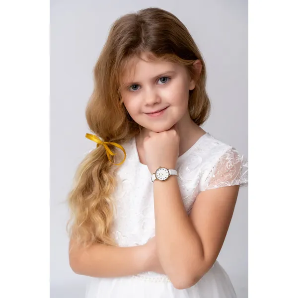 Elegáns és könnyen kombinálható lány karóra fehér bőrszíjjal, aranyszínű tokkal és jól olvasható számlappal. A japán kvarc szerkezet, az antiallergén bevonat és az ajándék díszdoboz praktikus, szép választássá teszik.