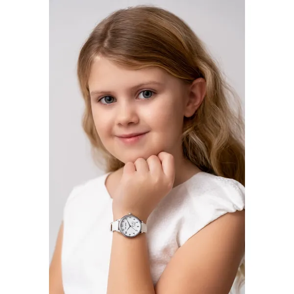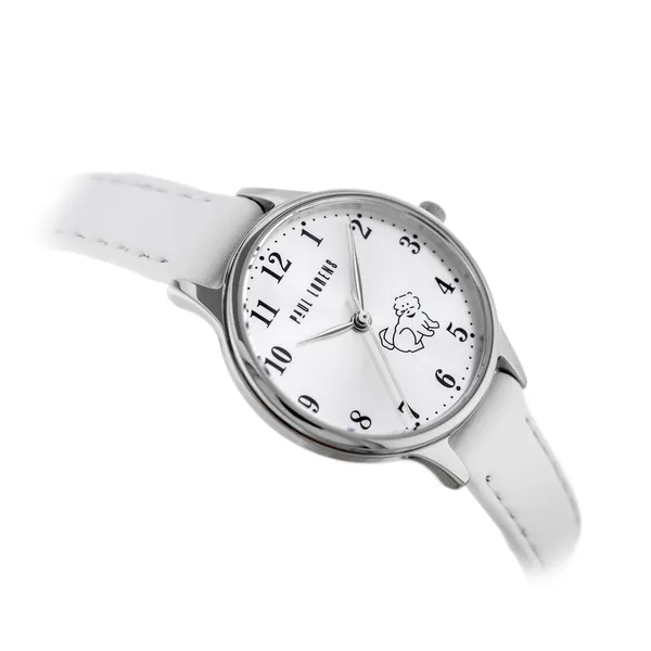 A fehér számlap kedves kutyás motívummal díszített, amely játékos, mégis esztétikus megjelenést ad az órának. A fehér bőrszíj és az ezüstszínű tok letisztult összhatást biztosít, ezért ajándéknak is remek választás.