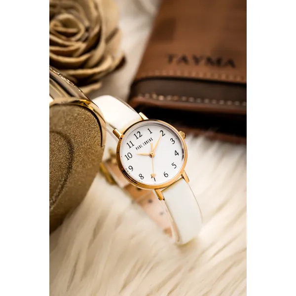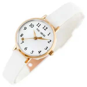 Elegáns, könnyen hordható karóra fehér bőrszíjjal és rózsaarany színű tokkal, amely ideális mindennapi viseletre vagy ajándéknak. A pontos japán kvarc szerkezet, a minerálüveg és az antiallergén bevonat kényelmes, megbízható használatot biztosít.