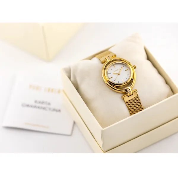 Az időtálló forma és a modern részletek harmonikus összhatást teremtenek. Az aranyszínű tok és acél szíj, valamint az ezüst színű számlap elegáns megjelenést ad, így ez az óra könnyedén kiemeli viselője stílusát.