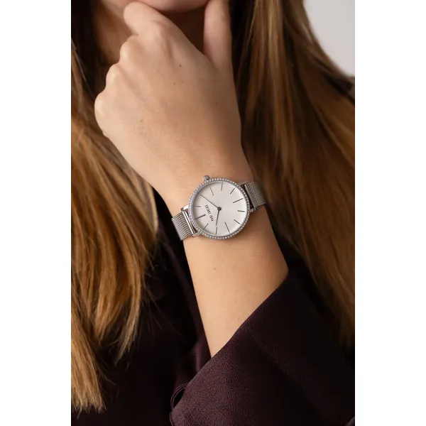 A kényelmes kialakítás a női csuklóhoz igazodik, így a karóra nemcsak mutatós, hanem kellemes viselet is. Az ezüst színű számlap és szíj harmonikus összhatást teremt, a cirkonokkal díszített tok pedig különleges ragyogást ad.