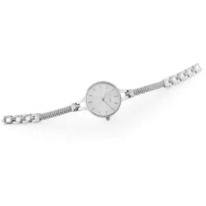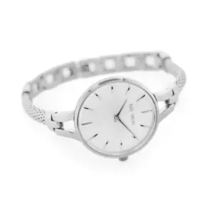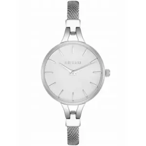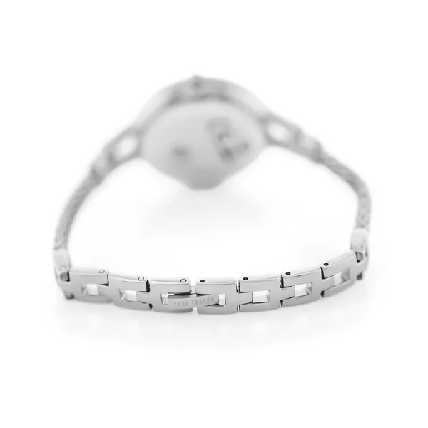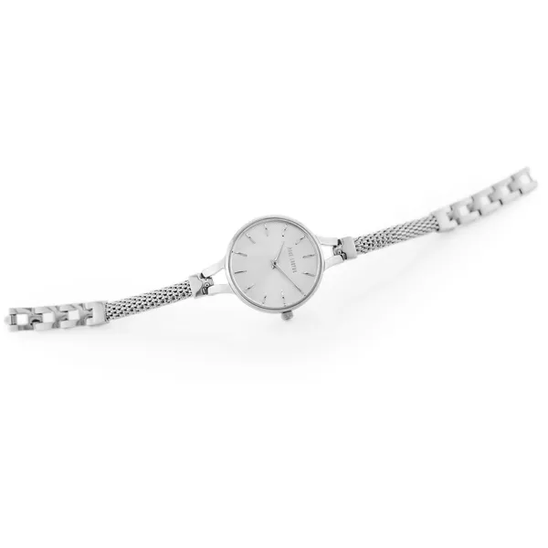 Az óra rozsdamentes acélból készült, ezüst színű kivitelben. Keskeny, finom fémcsatja harmonikusan illeszkedik a kerek tokhoz, míg a visszafogott textúrájú ezüst számlapon karcsú, lineáris mutatók jelzik az időt. A megjelenést tartós ásványi üveg védi, amely hozzájárul a hosszú távú, esztétikus használathoz.