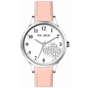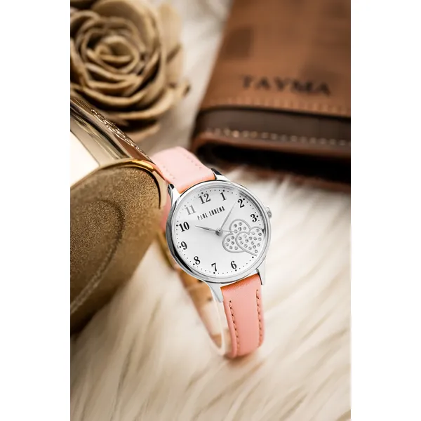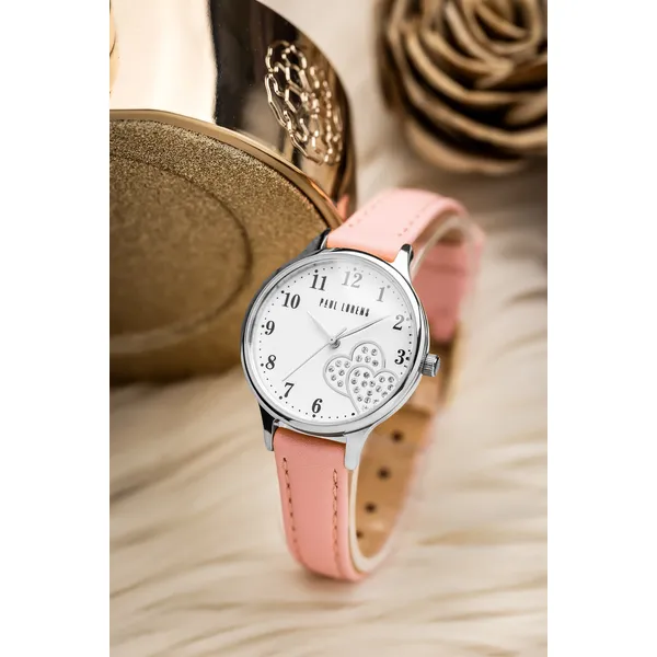 Paul Lorens női karóra, fehér szív mintás számlap, rózsaszín bőrszíj