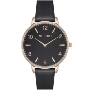 A Paul Lorens női karóra elegáns megjelenésével és gondosan kidolgozott részleteivel ideális választás mindennapi viselethez és alkalmi szettekhez is. A klasszikus fekete számlap, a rózsaarany színű tok és indexek, valamint a fekete bőrszíj harmonikus, nőies összhatást teremtenek.