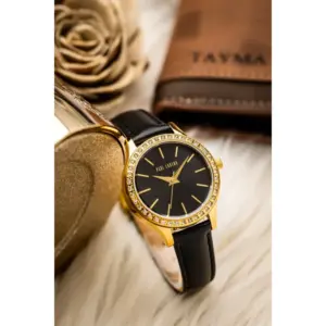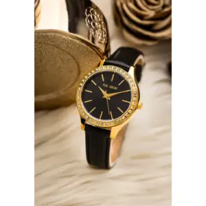 Elegáns női karóra fekete bőrszíjjal, aranyszínű, cirkóniákkal díszített tokkal és letisztult fekete számlappal. A megbízható kvarc szerkezet és a könnyen kombinálható, időtálló design kényelmes viseletet és kifinomult megjelenést ad minden alkalomra.