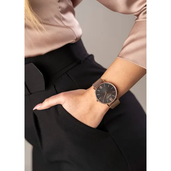 Elegáns, fekete számlapos női karóra rose arany színű hálós fém szíjjal, amely kényelmesen állítható és kifinomult megjelenést ad. A japán кварc szerkezet és az antiallergén bevonat megbízható, kényelmes mindennapi viseletet biztosít.