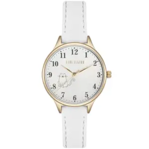 Paul Lorens női kvarc karóra, fehér bőrszíj, ezüst cica számlap