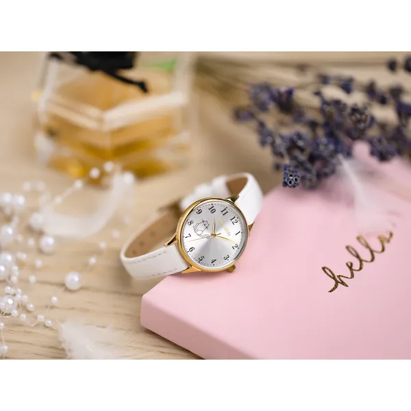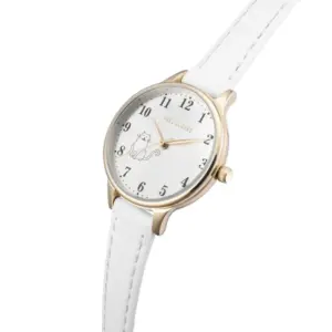 Elegáns és játékos választás a mindennapokra: a fehér bőrszíj és a cicamotívumos ezüst számlap különleges, mégis könnyen viselhető megjelenést ad. A megbízható japán kvarc szerkezet és az ajándék díszdoboz praktikus és szép választássá teszi.