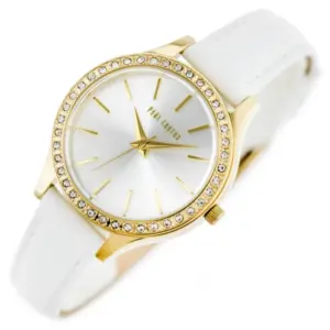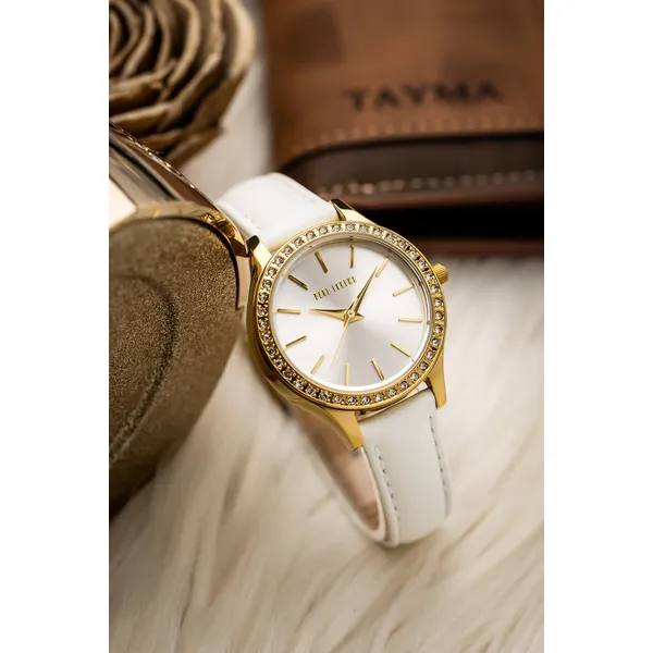 Az időtálló forma klasszikus részleteket párosít modern megjelenéssel. Az ezüst színű számlap, az aranyszínű, cirkóniákkal díszített tok és a fehér bőrszíj harmonikus összhatást ad, így ez az óra elegáns kiegészítője lehet szinte bármely összeállításnak.