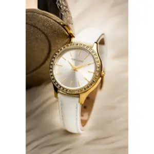 Elegáns női karóra fehér bőrszíjjal, ezüst számlappal és aranyszínű, cirkóniás tokkal, amely kifinomult megjelenést ad a hétköznapokon és alkalmakra is. A japán kvarc szerkezet, az ásványi üveg és az ajándék díszdoboz praktikus és stílusos választássá teszi.