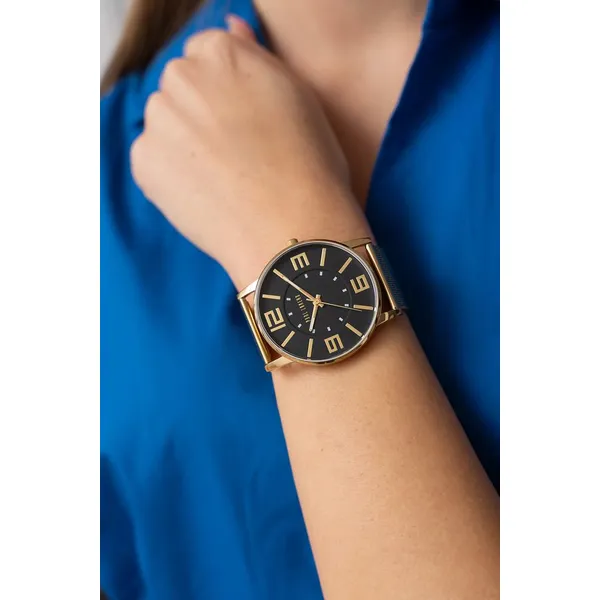 Elegáns, fekete-arany kialakításával könnyen kombinálható a hétköznapi és alkalmi öltözékkel is. A japán kvarc szerkezet pontos működést, a rozsdamentes acél szíj és az antiallergén bevonat pedig kényelmes, tartós viseletet biztosít.