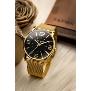 A megbízható japán Miyota kvarc szerkezet hosszú távon pontos időmérést biztosít. A fekete számlap arany indexekkel könnyen leolvasható, míg az aranyszínű tok és a rozsdamentes acél szíj elegáns, időtálló összhatást teremt. Az antiallergén bevonat növeli a viselési komfortot és a tartósságot.