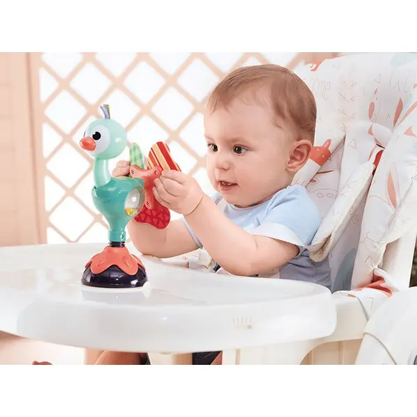 Páva csörgő tapadókoronggal – forgatható, színes babajáték
