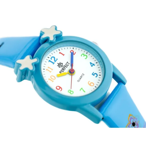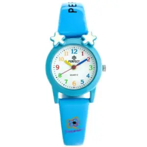 A Perfect A949 gyermek karóra bájos és praktikus választás mindennapi viseletre. Könnyű, kényelmes kialakítása ideálissá teszi játékhoz, iskolába vagy az idő leolvasásának tanulásához. A kék tok és a kék szíj harmonikusan egészíti ki a jól látható, fehér számlapot, így a karóra egyszerre vidám megjelenésű és könnyen használható.