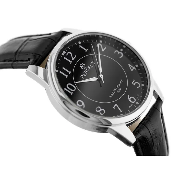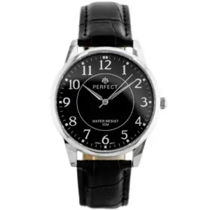 Perfect B7381 férfi karóra, fekete számlap, bőrszíj, ezüst tok