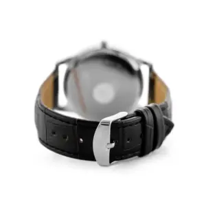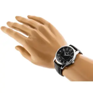 A fekete számlap, a fehér jelölések, az ezüstszínű tok és a fekete bőrszíj időtálló, sokoldalúan viselhető kombinációt alkotnak. A 30 méteres vízállóság a mindennapi fröccsenések ellen nyújt védelmet, ezért a modell kiváló választás lehet általános napi használatra.