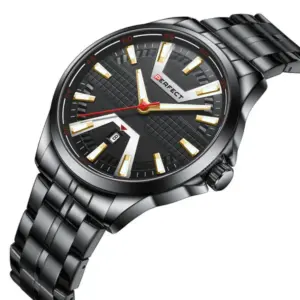 Elegáns fekete-arany kivitelű férfi karóra pontos japán kvarc szerkezettel és praktikus dátumkijelzővel. A tartós fém szíj és a karakteres, mégis sokoldalú design ideálissá teszi mindennapi és alkalmi viselethez is.