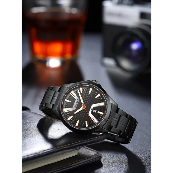 A megbízható, japán Miyota kvarc szerkezet pontos időmérést biztosít, a fekete-arany színvilág pedig karakteres, mégis könnyen kombinálható megjelenést ad. A dátumkijelző praktikus kiegészítő a mindennapokban, a fém szíj pedig tartós és kényelmes viseletet nyújt.