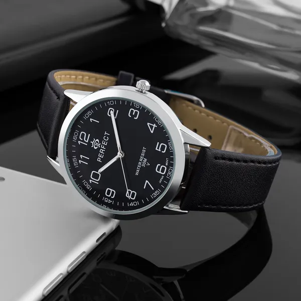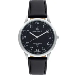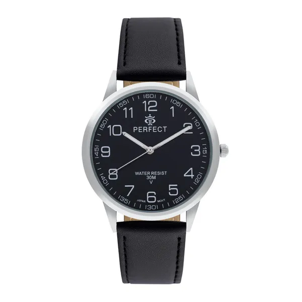 Perfect férfi karóra letisztult, elegáns megjelenéssel. Az ezüstszínű tok és a fekete számlap időtálló kombináció, amely jól illik mindennapi viselethez és alkalmi öltözethez is.