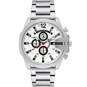Perfect férfi karóra kronográffal, fehér számlappal, ezüst fém szíj