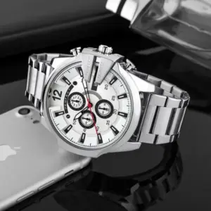 Elegáns, mégis határozott megjelenésű férfi karóra pontos кварc szerkezettel, kronográf funkcióval és dátumkijelzéssel. Az ezüstszínű fém szíj, a fehér számlap és a mineral üveg tartós, sokoldalúan viselhető választássá teszi a mindennapokra.