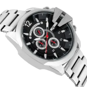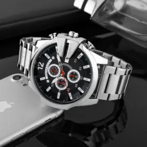 Sportosan elegáns férfi karóra pontos kvarc szerkezettel, kronográffal és dátumkijelzéssel. A fekete számlap, az ezüstszínű fémcsat és az ásványi üveg tartós, jól kombinálható választássá teszi a mindennapokra.