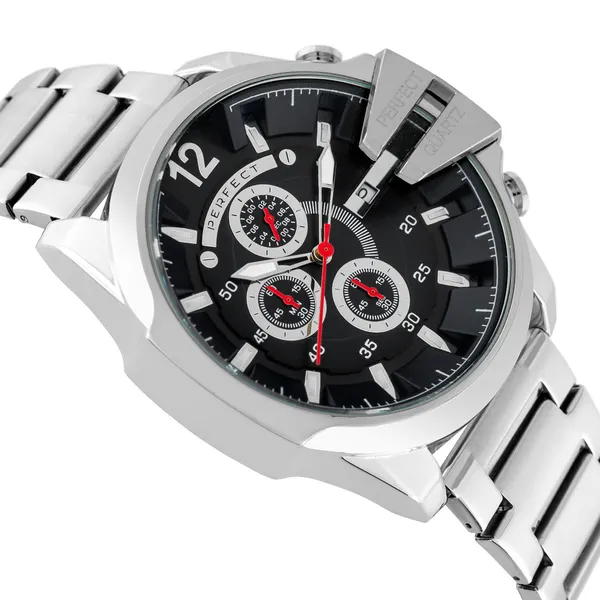 Perfect férfi karóra kronográffal, fekete számlappal, ezüst fémcsattal