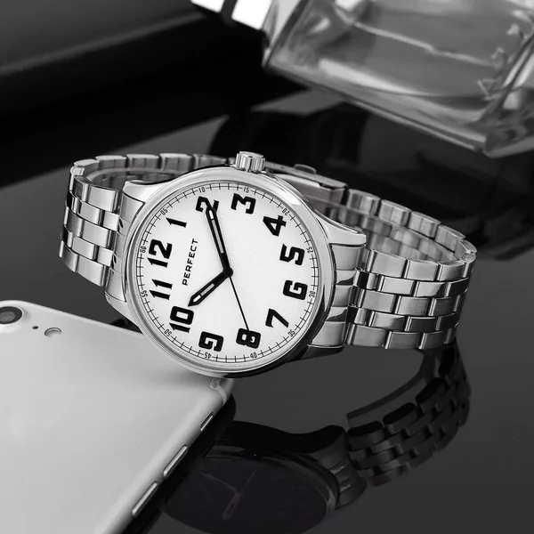 A Perfect férfi karóra praktikus választás a mindennapokra és alkalmi viselethez is. A megbízható, japán Miyota kvarc szerkezet pontos időmérést biztosít, míg az ezüstszínű tok és fém szíj letisztult, könnyen kombinálható megjelenést ad.