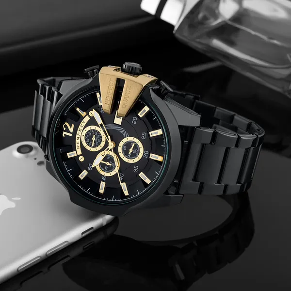 A Perfect férfi karóra stílusos megjelenést és praktikus funkciókat kínál a mindennapokra. A fekete számlap, az aranyszínű indexek és a fekete-arany tok modern, karakteres összhatást teremtenek, így ez a modell alkalmi és hétköznapi viselethez is jó választás.