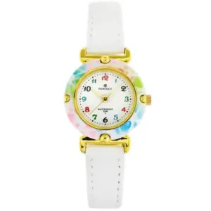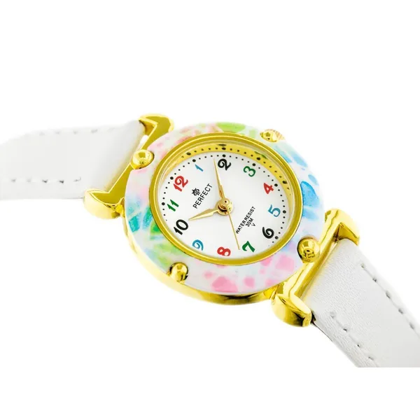 Perfect lány karóra fehér bőrszíjjal, aranyszínű tokkal