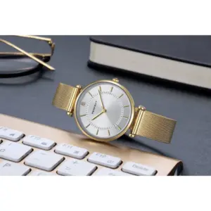 Elegáns női karóra aranyszínű fémszíjjal és ezüst számlappal, amely könnyen illik hétköznapi és alkalmi öltözékhez. A japán кварc szerkezet pontos működést, az ásványi üveg pedig megbízható védelmet nyújt a mindennapi használat során.