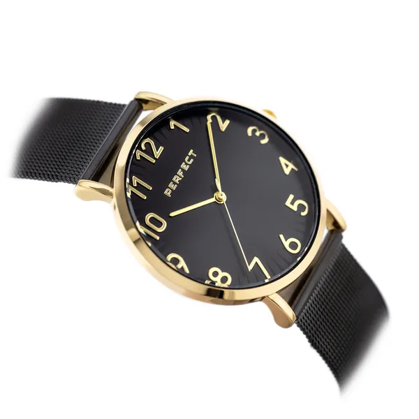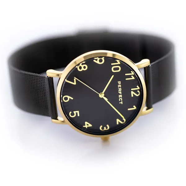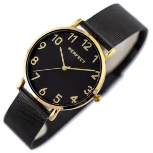 A Perfect női karóra elegáns, időtálló választás a mindennapokra és alkalmi megjelenéshez is. A fekete számlap és a fekete szíj harmonikusan egészíti ki az aranyszínű tokot, így a modell kifinomult, mégis sokoldalúan viselhető.