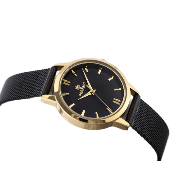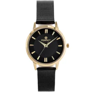 A Perfect női karóra elegáns megjelenést kínál a mindennapokra és alkalmi viselethez is. A fekete számlap és a fekete fémcsat harmonikusan egészíti ki az aranyszínű tokot, így ez a modell kifinomult, mégis könnyen kombinálható választás.