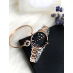 Elegáns, fekete számlapos női karóra ezüst és rozéarany színű fém szíjjal, amely könnyen illik hétköznapi és alkalmi szettekhez. A japán кварc szerkezet pontos működést, a mineral üveg pedig praktikus védelmet nyújt a mindennapokban.