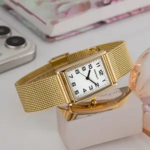 Elegáns, arany színű női karóra megbízható japán kvarc szerkezettel és kényelmesen állítható csattal. A mineralüveg, az antiallergén bevonat és a díszdobozos csomagolás praktikus, ajándéknak is ideális választássá teszi.