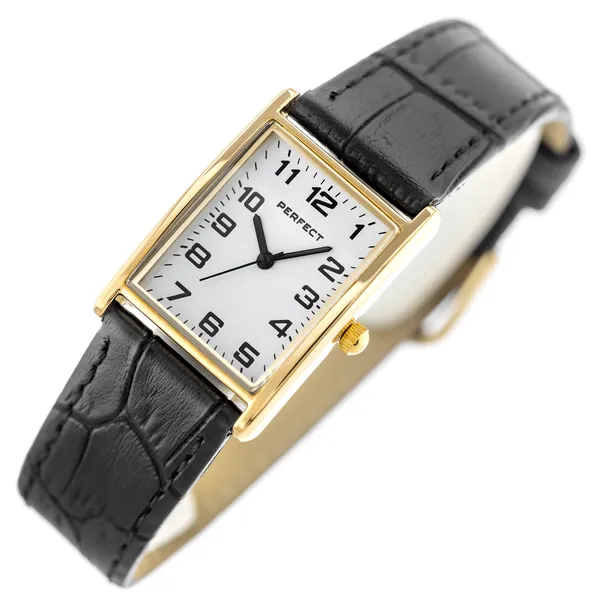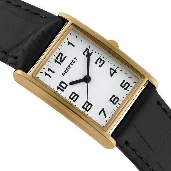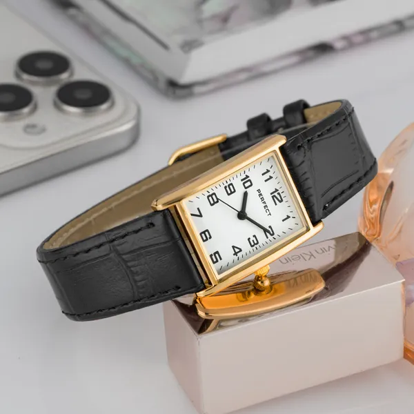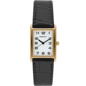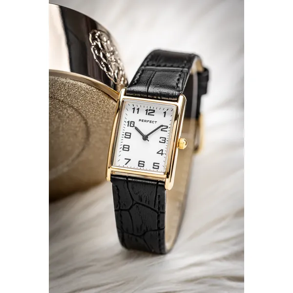 Perfect női karóra aranyszínű tokkal, fekete bőrszíjjal