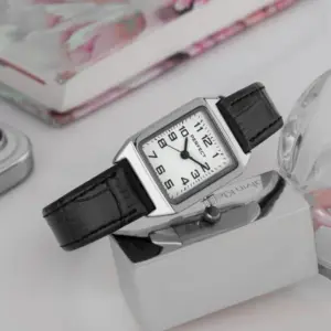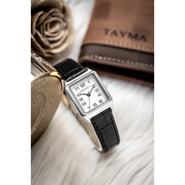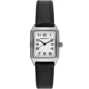 A Perfect női karóra elegáns, letisztult megjelenésével kiváló választás a mindennapokra és alkalmi viselethez is. A fehér számlap, az ezüstszínű tok és a fekete valódi bőrszíj klasszikus összhatást teremt, amely könnyen kombinálható különböző öltözékekkel.