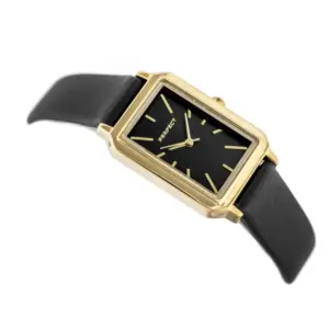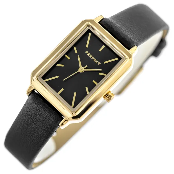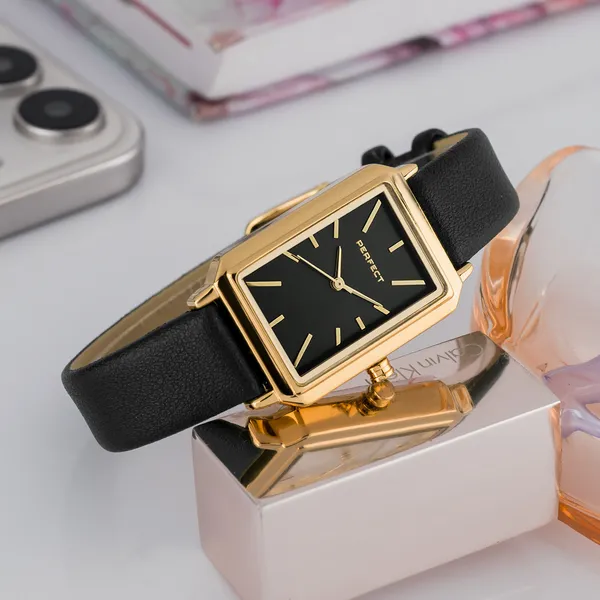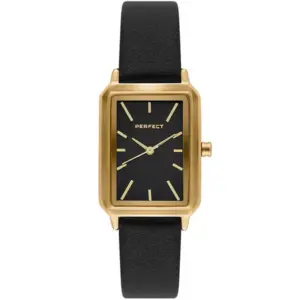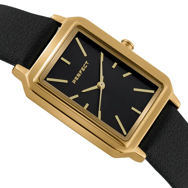 A Perfect női karóra elegáns megjelenést és megbízható működést kínál a mindennapokra. A fekete számlap, az aranyszínű tok és a fekete bőrszíj időtálló, könnyen kombinálható stílust alkot, amely hétköznapi és alkalmi viselethez is remek választás.